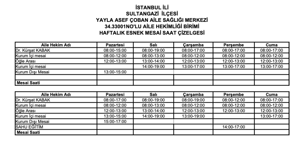 Dr. Kürşat KABAK Mesai Saatleri